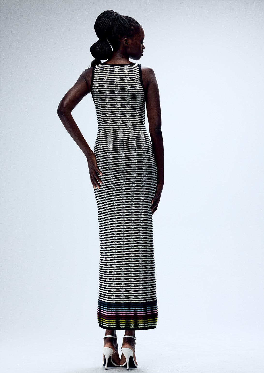 Crafted from mercerized Italian cotton, this maxi dress hugs and elongates the body — sculpting rather than squeezing. The black-and-ivory wave stitch ripple down the column for an optical effect, finished with a band of earthy brights at the hem. This sleek, streamlined knit moves with you and feels just as right at a gallery opening as it does for a beachside evening.