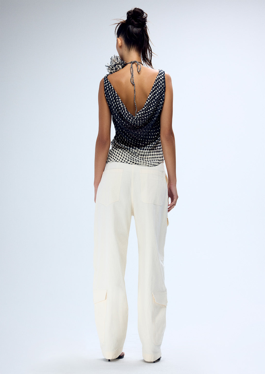 An op-art twist on a classic shell, this airy crinkle chiffon top is crafted from CJR’s signature Halftone Wiggle Dot print — a pattern that shifts and shimmers with movement. A clean bateau neckline in front contrasts with a draped cowl back that dips just enough to feel elegant without trying. Light as air and slightly sheer, it's perfect layered under a jacket, or left to move on its own.