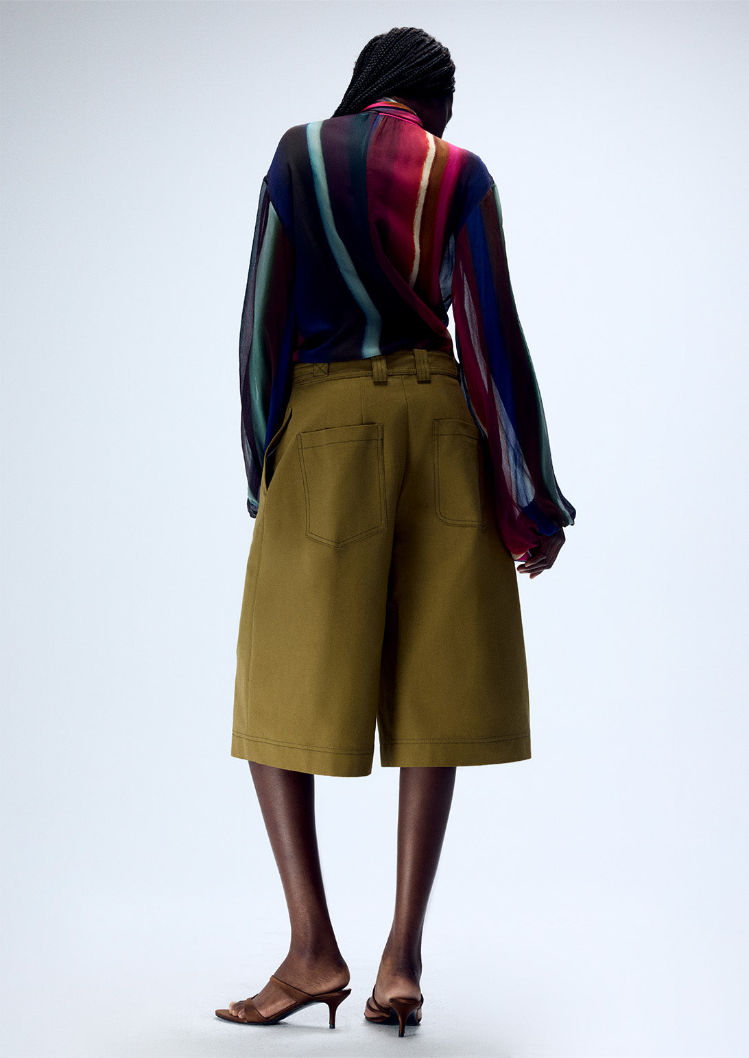 A sheer, weightless blouse in our Louie stripe crinkle chiffon. Cut with an easy drape and finished with a long self-scarf that can be tied into a bow, looped once like a tie, or left to flutter free. Sleeves fall soft and fluid with just enough volume to keep the silhouette dramatically unfussy.