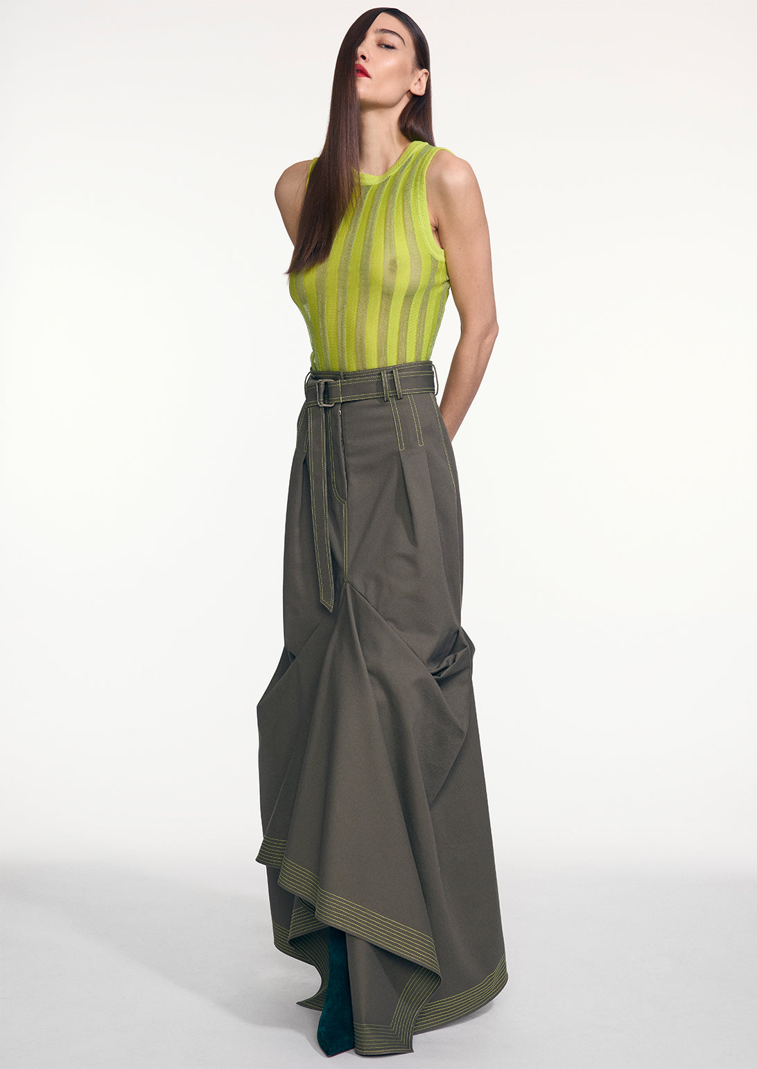 Dipped in a shocking Escargot green and ribbed for your pleasure, this shell is crafted from a melange of Italian sheer filament and seasonal merino wool, punctuated with an alpaca trim. Pair with the matching PLEATED CARDIGAN WITH ALPACA TRIM for a modern update on the midcentury twinset!