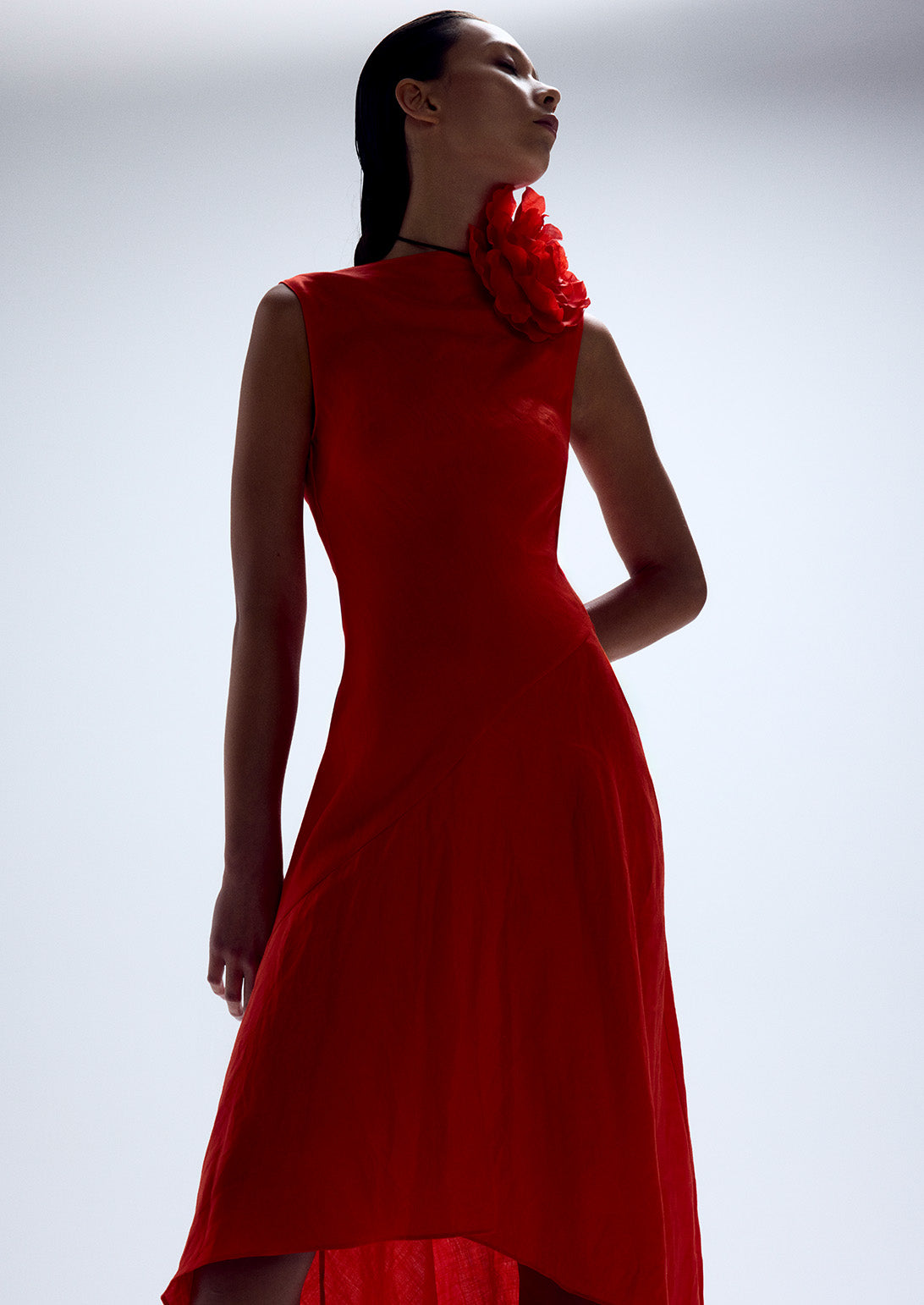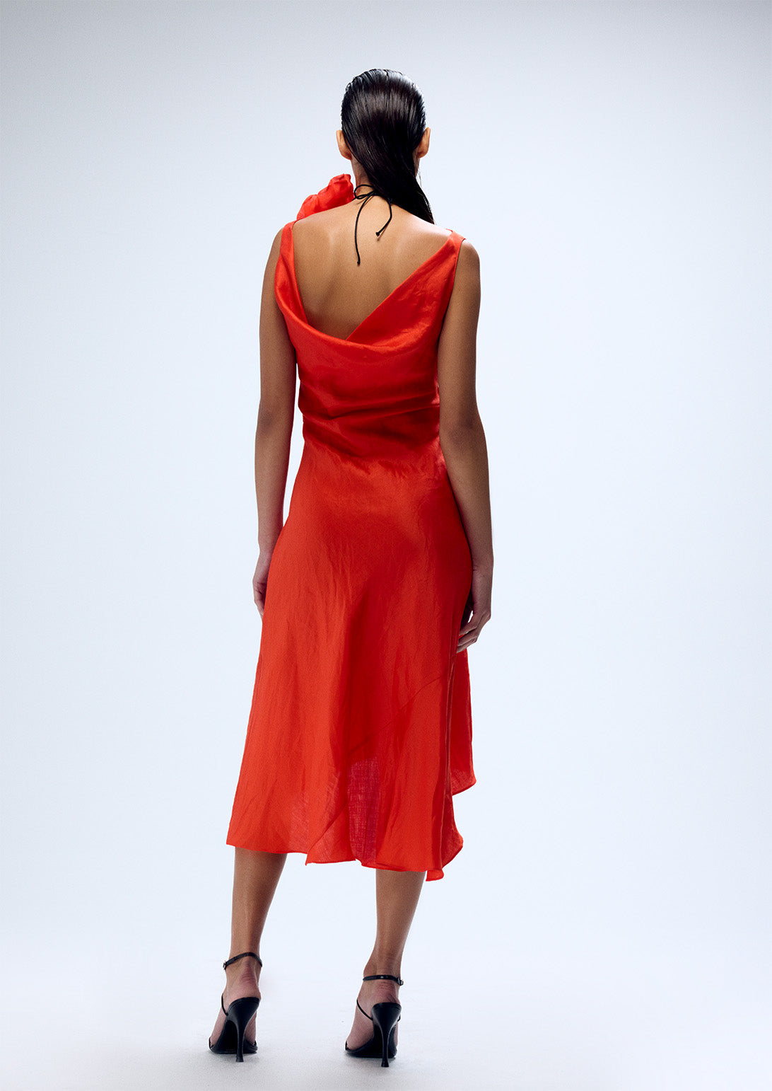 Cut on the bias from our signature Crawfish-colored satin ramie organza, this dress skims the body with ease and falls into a soft asymmetric hem. The high neckline gives way to a plunging cowl back, creating an effortless counterpoint of structure and drape. We love it un-steamed for a lived-in patina—the fabric behaves like a polished version of linen, with a fluid, feminine hand that moves beautifully.